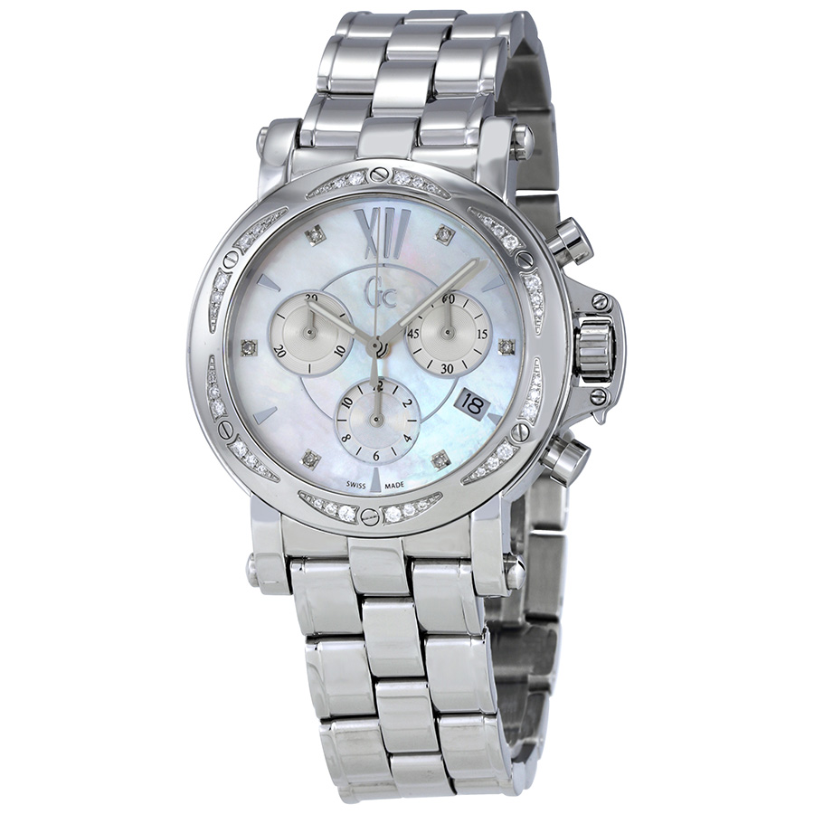 Silver-tone stainless steel case with a silver-tone stainless steel bracelet. Fixed, crystal set silver-tone stainless steel bezel. Mother of pearl dial with silver-tone hands and index hour markers. Dial Type: Analog. Date display at the 4 o'clock position. Chronograph - sub-dials displaying: three - 60 second, 30 minute and 12 hours. Quartz movement. Scratch resistant sapphire crystal. Solid case back. Case size: 37.5 mm. Round case shape. Water resistant at 100 meters / 330 feet. Functions: chronograph, date, hour, minute, second. Dress watch style. Watch label: Swiss Made. Guess GC Mother of Pearl Dial Ladies Chronograph Watch X73106M1S.