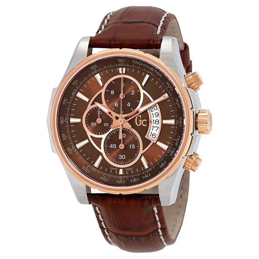 Stainless steel case with a brown (calfskin) leather strap. Fixed rose gold-plated bezel. Brown dial with luminous rose gold-tone hands and index hour markers. Minute markers. Tachymeter markings around the outer rim. Luminescent hands and markers. Date display at the 3 o'clock position. Chronograph - three sub-dials displaying: 60 second, 60 minute and 1/10th of a second. Quartz movement. Scratch resistant synthetic sapphire crystal. Solid case back. Case size: 44 mm. Case thickness: 12 mm. Round case shape. Band width: 20 mm. Tang clasp. Water resistant at 100 meters / 330 feet. Functions: chronograph, tachymeter, date, hour, minute, second. Casual watch style. Watch label: Swiss Made. Guess Techno Class Chronograph Brown Dial Mens Watch X81002G4S.