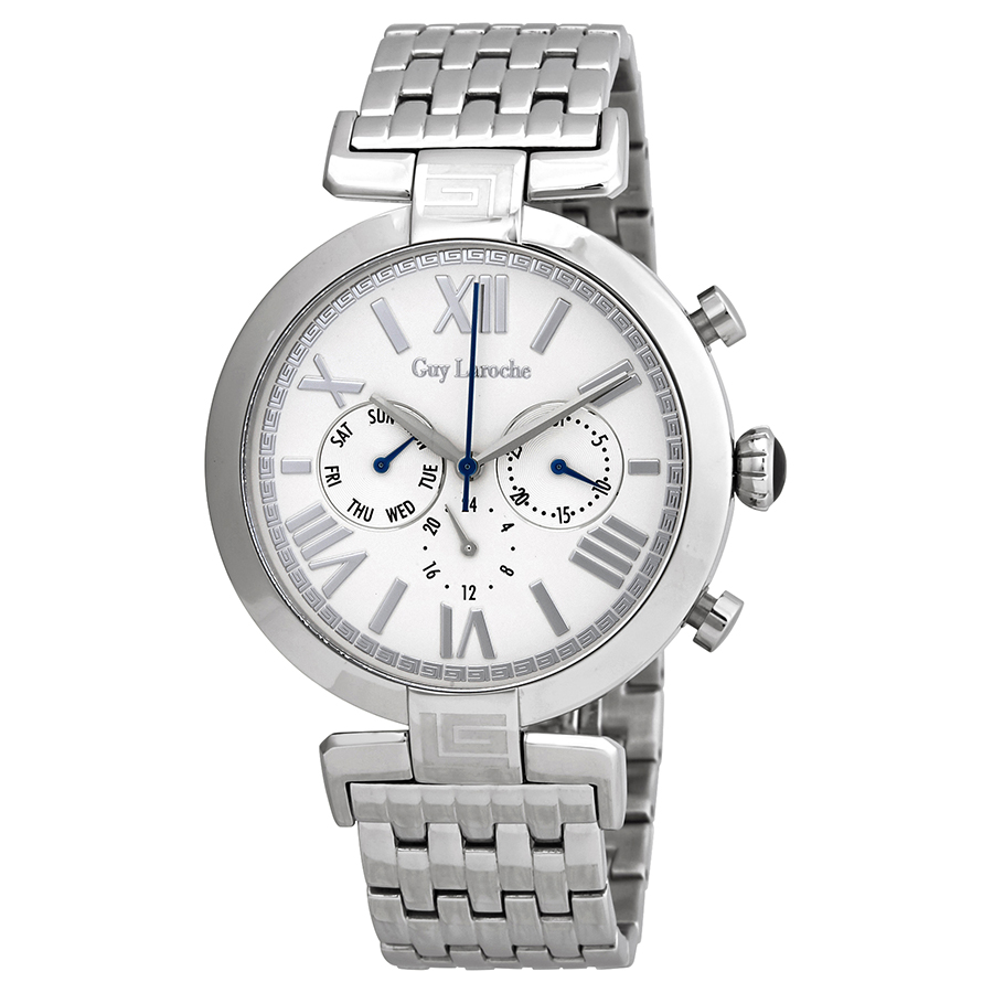 Stainless steel case with a stainless steel bracelet. Fixed stainless steel bezel. Cream dial with silver-tone hands and alternating Roman numeral and index hour markers. Dial Type: Analog. Luminescent hands and markers. Three multi-function sub-dials displaying: date, day of the week and 24 hour. Quartz movement. Scratch resistant sapphire crystal. Solid case back. Round case shape. Case size: 42.5 mm. Case thickness: 10 mm. Band width: 20 mm. Hidden fold over clasp. Water resistant at 50 meters / 165 feet. Functions: date, day, hour, minute, second. Dress watch style. Guy Laroche Multifunction Cream Dial Mens Watch G2009-05.