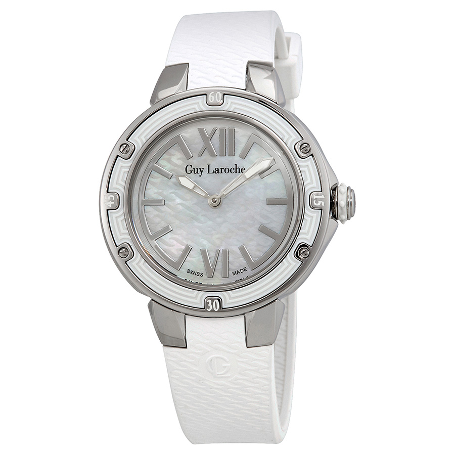 Stainless steel case with a white rubber strap. Fixed stainless steel bezel. Mother of pearl dial with luminous silver-tone hands and index hour markers. Roman numerals mark the 6 and 12 o'clock positions. Dial Type: Analog. Luminescent hands. Quartz movement. Scratch resistant sapphire crystal. Pull / push crown. Solid case back. Round case shape. Case size: 38 mm. Case thickness: 9 mm. Band width: 18 mm. Water resistant at 50 meters / 165 feet. Functions: hour, minute. Casual watch style. Watch label: Swiss Made. Guy Laroche Mother of Pearl Dial Mens Watch GL6214-02.