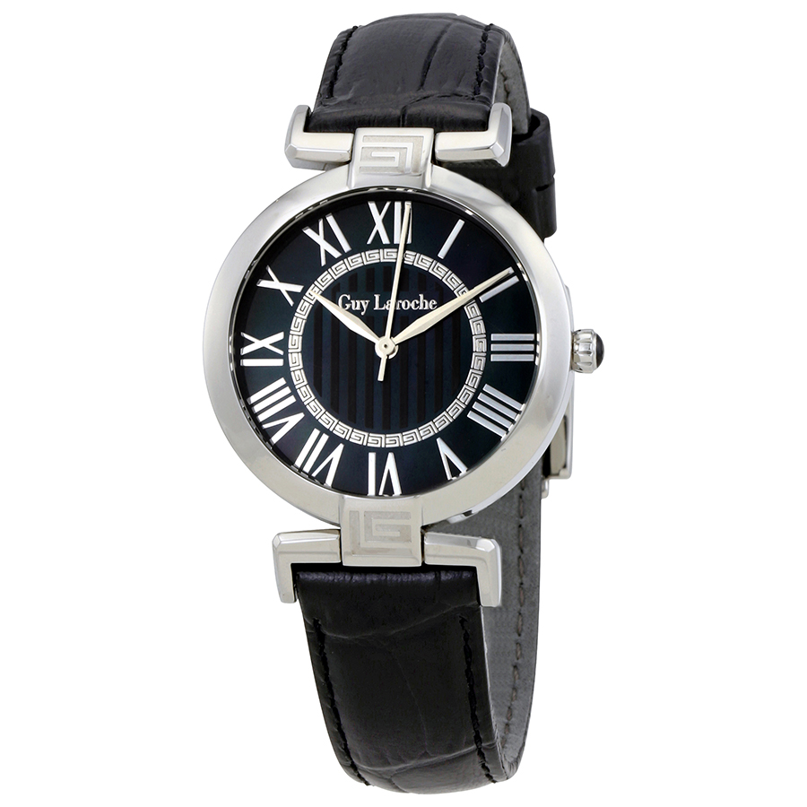 Silver-tone stainless steel case with a black leather strap. Fixed stainless steel bezel. Black dial with silver-tone hands and Roman numeral hour markers. Dial Type: Analog. Quartz movement. Scratch resistant sapphire crystal. Solid case back. Case size: 32 mm. Round case shape. Tang clasp. Water resistant at 50 meters / 165 feet. Functions: hour, minute, second. Casual watch style. Guy Laroche Far East Black Dial Ladies Leather Watch L2008-01.