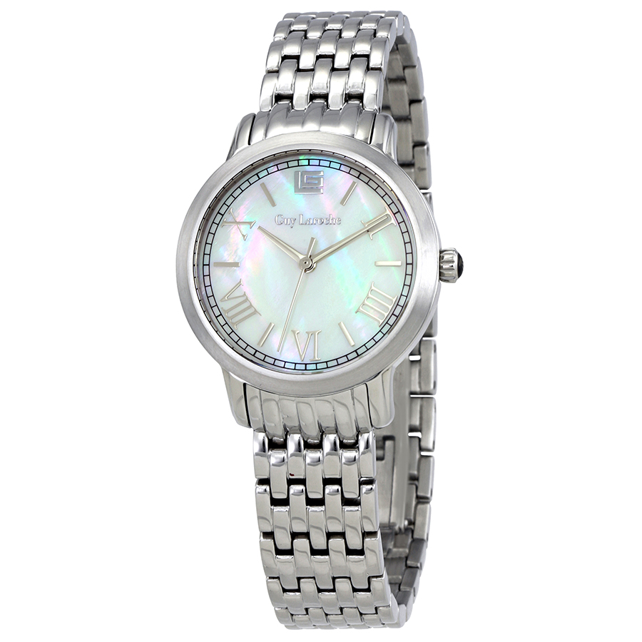 Silver-tone stainless steel case with a silver-tone stainless steel bracelet. Fixed stainless steel bezel. White mother of pearl dial with silver-tone hands and Roman numeral hour markers. Dial Type: Analog. Quartz movement. Scratch resistant sapphire crystal. Pull / push crown. Solid case back. Case size: 30 mm. Round case shape. Water resistant at 50 meters / 165 feet. Functions: hour, minute, second. Dress watch style. Guy Laroche Far East White Mother of Pearl Dial Ladies Watch L2012-01.