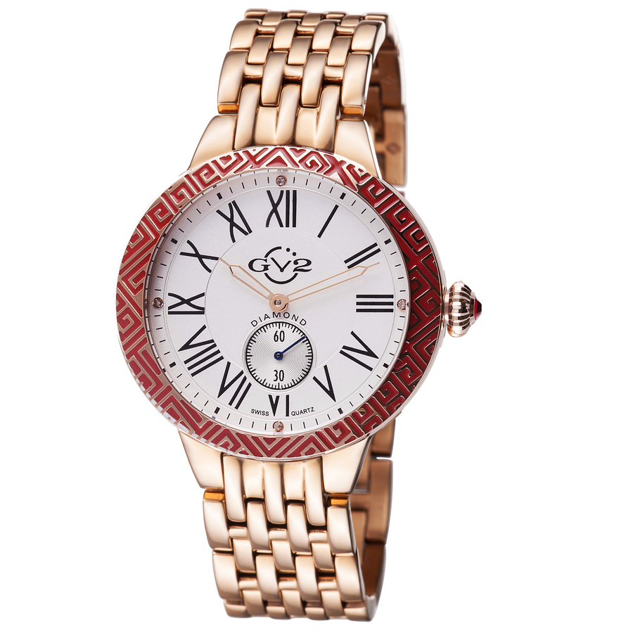 Rose gold-tone stainless steel case with a rose gold-tone stainless steel bracelet. Fixed red stainless steel bezel. White dial with rose gold-tone hands and Roman numeral & diamond hour markers. Minute markers around the outer rim. Dial Type: Analog. One subdial displaying: small second. Ronda Caliber 1069 quartz movement. Scratch resistant sapphire crystal. Pull / push crown. Solid case back. Round case shape, case size: 40 mm, case thickness: 9.5 mm. Band width: 18 mm. Deployment with push button release clasp. Water resistant at 30 meters / 100 feet. Functions: hour, minute, second. Astor Enamel Series. Fashion watch style. Watch label: Swiss Movt. GV2 by Gevril Astor Enamel Quartz Diamond White Dial Ladies Watch 9121B.