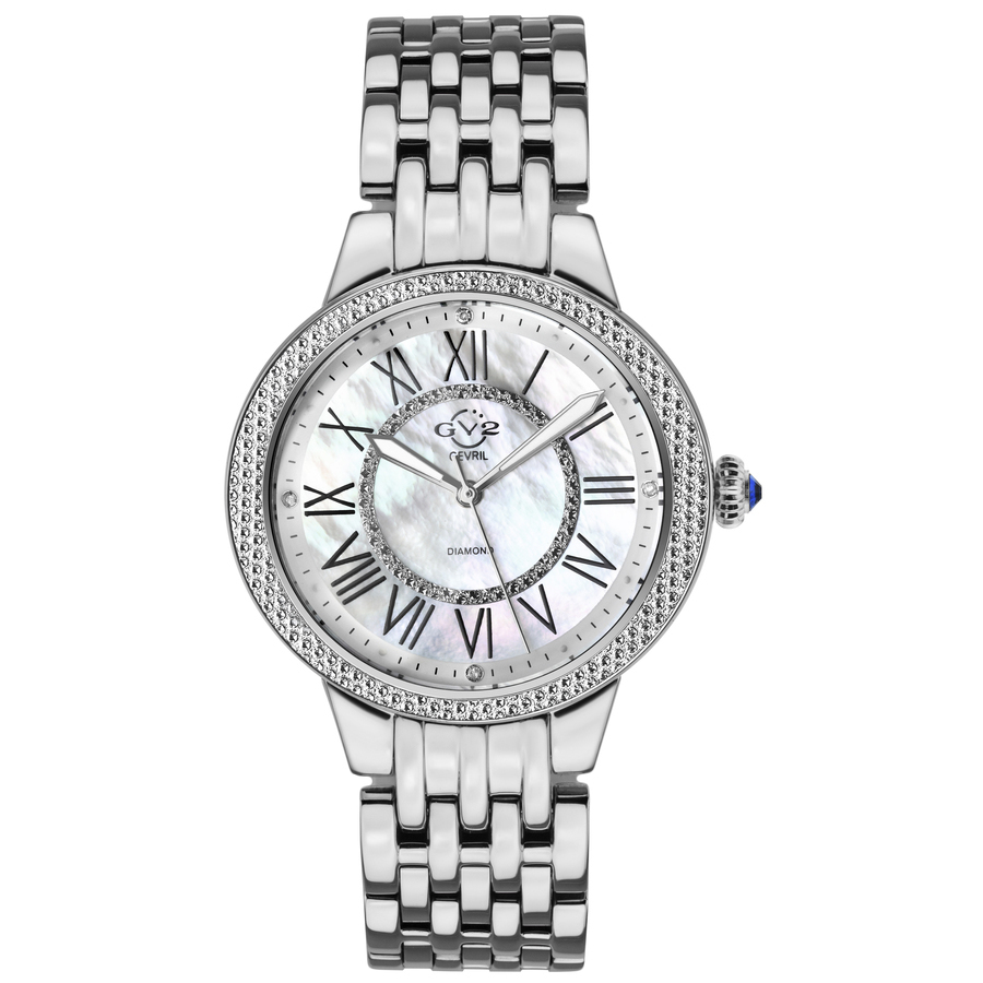 Stainless steel case with a stainless steel bracelet. Fixed stainless steel diamond cut bezel. Mother of pearl (diamond cut) dial with silver-tone sword-shaped hands and Roman numeral hour markers. Diamonds set at the 3, 6, 9 and 12 o'clock positions. Minute markers around the outer rim. Dial Type: Analog. Luminescent hands. Quartz movement. Scratch resistant sapphire crystal. Pull / push crown. Solid case back. Round case shape. Case size: 38 mm. Case thickness: 10 mm. Band width: 18 mm. Deployment clasp with a push button release. Water resistant at 30 meters / 100 feet. Functions: hour, minute, second. Astor II Series. Fashion watch style. Watch label: Swiss Made. GV2 by Gevril Astor II Quartz Mother of Pearl Diall Diamond Ladies Watch 9140.
