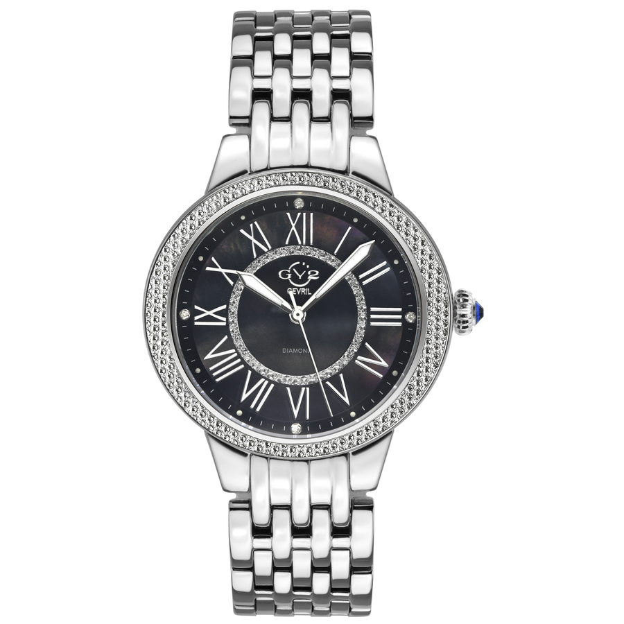 Stainless steel case with a stainless steel bracelet. Fixed stainless steel diamond cut bezel. Mother of pearl dial with luminous silver-tone sword-shaped hands and Roman numeral hour markers. Diamonds set at the 3, 6, 9 and 12 o'clock positions. Minute markers around the outer rim. Dial Type: Analog. Luminescent hands. Quartz movement. Scratch resistant sapphire crystal. Pull / push crown. Solid case back. Round case shape. Case size: 38 mm. Case thickness: 10 mm. Band width: 18 mm. Deployment clasp with a push button release. Water resistant at 30 meters / 100 feet. Functions: hour, minute, second. Astor II Series. Fashion watch style. Watch label: Swiss Made. GV2 by Gevril Astor II Quartz Mother of Pearl Dial Diamond Ladies Watch 9143.