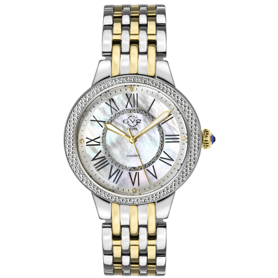 Stainless steel case with a two-tone (silver-tone and yellow gold-tone) stainless steel bracelet. Fixed stainless steel diamond cut bezel. Mother of pearl dial with gold-tone sword-shaped hands and Roman numeral hour markers. Diamonds set at the 3, 6, 9 and 12 o'clock positions. Minute markers around the outer rim. Dial Type: Analog. Luminescent hands. Quartz movement. Scratch resistant sapphire crystal. Pull / push crown. Solid case back. Round case shape. Case size: 38 mm. Case thickness: 10 mm. Band width: 18 mm. Deployment clasp with a push button release. Water resistant at 30 meters / 100 feet. Functions: hour, minute, second. Astor II Series. Fashion watch style. Watch label: Swiss Made. GV2 by Gevril Astor II Quartz Mother of Pearl Dial Diamond Ladies Watch 9145.