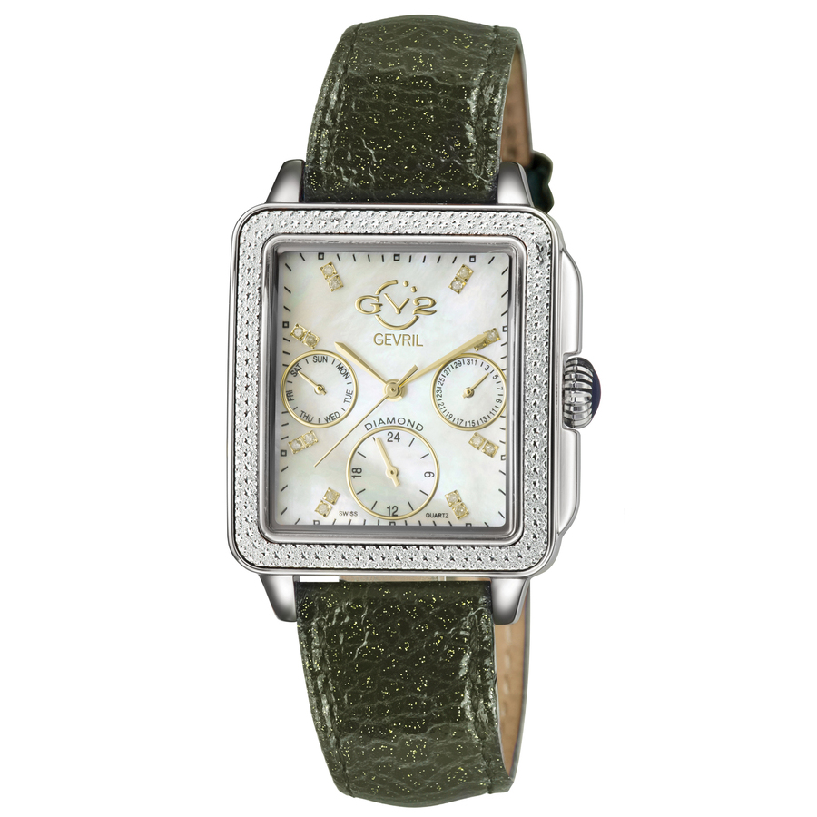 Silver-tone stainless steel case with a green leather strap. Fixed silver-tone bezel. White dial with gold-tone hands and diamond hour markers. Minute markers around the outer rim. Dial Type: Analog. Date display at the 3 o'clock position. Three - 24 hours, day, date subdials. ISA Calibre 9238A0 quartz movement. Scratch resistant sapphire crystal. Pull / push crown. Solid case back. Rectangle case shape, case size: 37 mm, case thickness: 8.8 mm. Buckle clasp. Water resistant at 50 meters / 165 feet. Functions: date, day, hour, minute, second. Fashion watch style. Watch label: Swiss Movt. GV2 by Gevril Bari Sparkle Quartz White Dial Ladies Watch 9230.