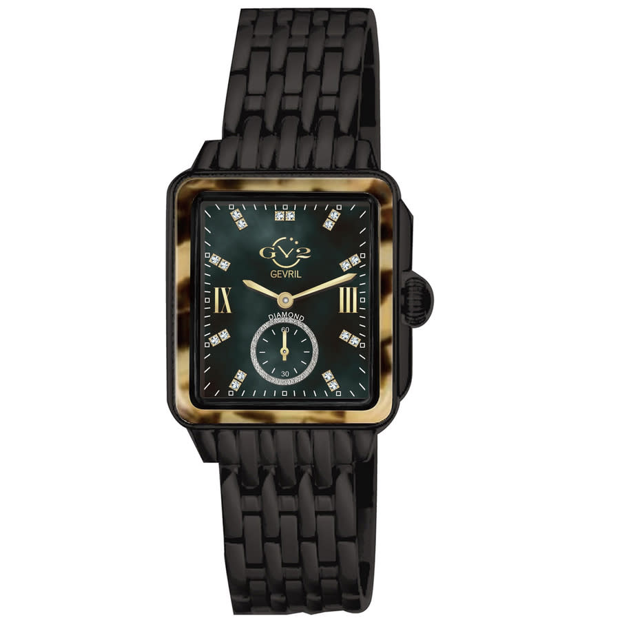 The picturesque city of Bari Italy provided the inspiration for the popular ladies GV2 Bari Collection Known throughout the world as the city of St Nicholas, it is no surprise that the historic town would continue to inspire the designers.The new line extension retains the Bari’s sophisticated rectangular mother-of-pearl dial embellished with eighteen glittering diamonds indices; adding a well placed 60-second sub dial. This Bari collection has been fitted with a beautiful pumpkin shape crown. Black stainless steel case and bracelet. Fixed bezel. Mother of pearl dial with gold-tone hands and diamond hour markers. Minute markers around the outer rim. Dial Type: Analog. Quartz movement. Scratch resistant sapphire crystal. Pull / push crown. Solid case back. Rectangle case shape, case size: 34 mm, case thickness: 12 mm. Band width: 18 mm. Deployment with push button release clasp. Water resistant at 50 meters / 165 feet. Functions: hour, minute, second. Additional Info: diamonds, seconds subdail. Bari Tortoise Series. Fashion watch style. GV2 by Gevril Bari Tortoise Diamond Mother of Pearl Dial Ladies Watch 9243B.