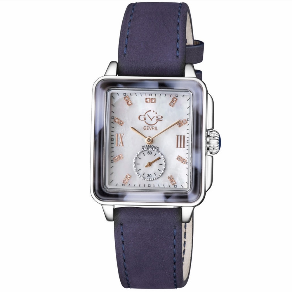 Silver-tone stainless steel case with a blue leather strap. Fixed silver-tone stainless steel bezel. Mother of pearl dial with rose gold-tone hands and Roman numeral & index hour markers. Minute markers around the outer rim. Dial Type: Analog. One subdial displaying: small second. Ronda Caliber 1069 quartz movement. Scratch resistant sapphire crystal. Pull / push crown. Solid case back. Rectangle case shape, case size: 34 mm, case thickness: 12 mm. Band width: 18 mm. Buckle clasp. Water resistant at 50 meters / 165 feet. Functions: hour, minute, small second. Additional Info: seconds subdail. Bari Tortoise Series. Fashion watch style. Watch label: Swiss Movt. GV2 by Gevril Bari Tortoise Mother of Pearl Dial Ladies Watch 9244.