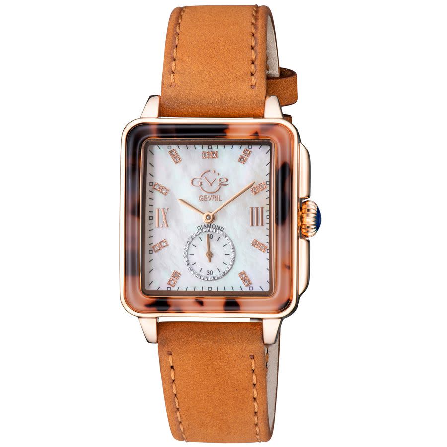 Rose gold-tone stainless steel case with a brown leather strap. Fixed stainless steel bezel. Mother of pearl dial with rose gold-tone hands and Roman numeral & index hour markers. Minute markers around the outer rim. Dial Type: Analog. Ronda 1069 quartz movement. Scratch resistant sapphire crystal. Pull / push crown. Solid case back. Rectangle case shape, case size: 34 mm, case thickness: 12 mm. Band width: 18 mm. Buckle clasp. Water resistant at 50 meters / 165 feet. Functions: hour, minute, second. Additional Info: seconds subdail. Bari Tortoise Series. Fashion watch style. GV2 by Gevril Bari Tortoise Quartz Ladies Watch 9245.1.