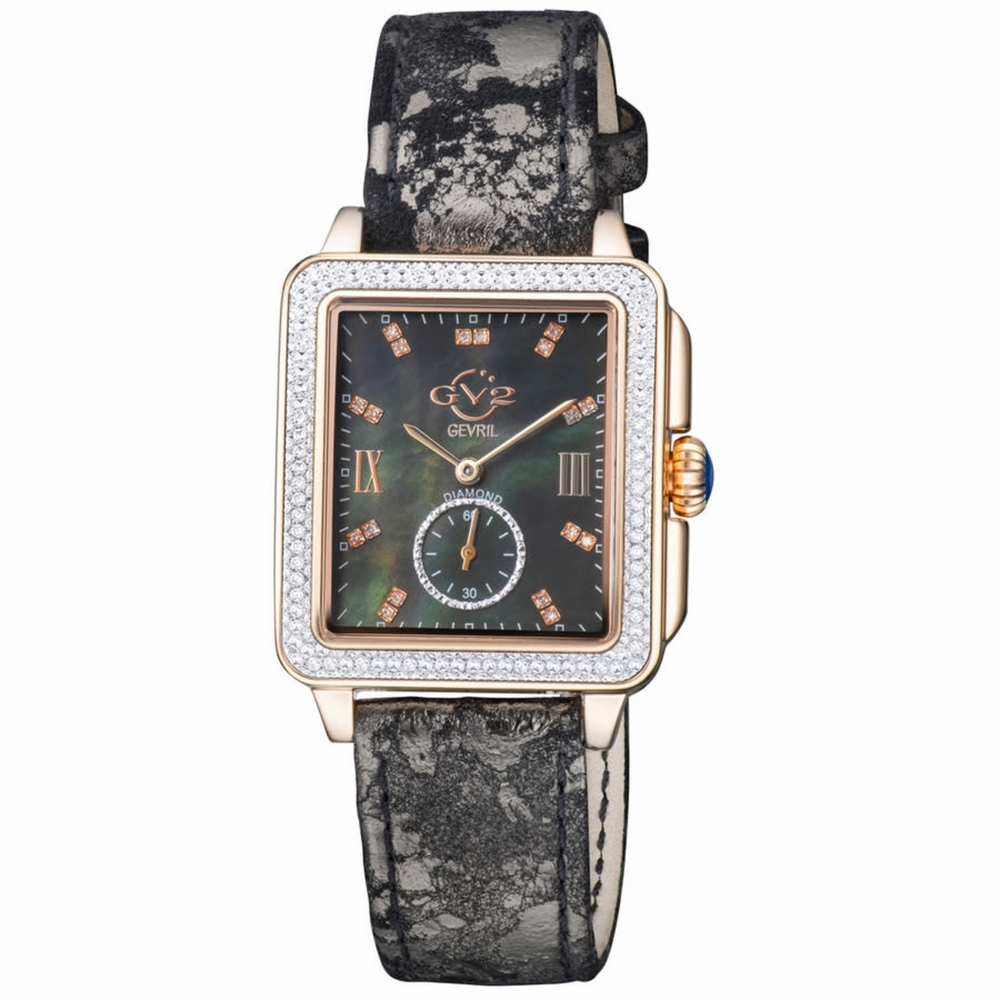 Rose gold-tone stainless steel case with a brown leather strap. Fixed rose gold-tone stainless steel bezel. Mother of pearl dial with rose gold-tone hands and Roman numeral & index hour markers. Minute markers around the outer rim. Dial Type: Analog. One subdial displaying: small second. Ronda Caliber 1069 quartz movement. Scratch resistant sapphire crystal. Pull / push crown. Solid case back. Rectangle case shape, case size: 34 mm, case thickness: 10.5 mm. Band width: 18 mm. Buckle clasp. Water resistant at 50 meters / 165 feet. Functions: hour, minute, small second. Bari Tortoise Series. Fashion watch style. Watch label: Swiss Movt. GV2 by Gevril Bari Tortoise Mother of Pearl Dial Ladies Watch 9250.