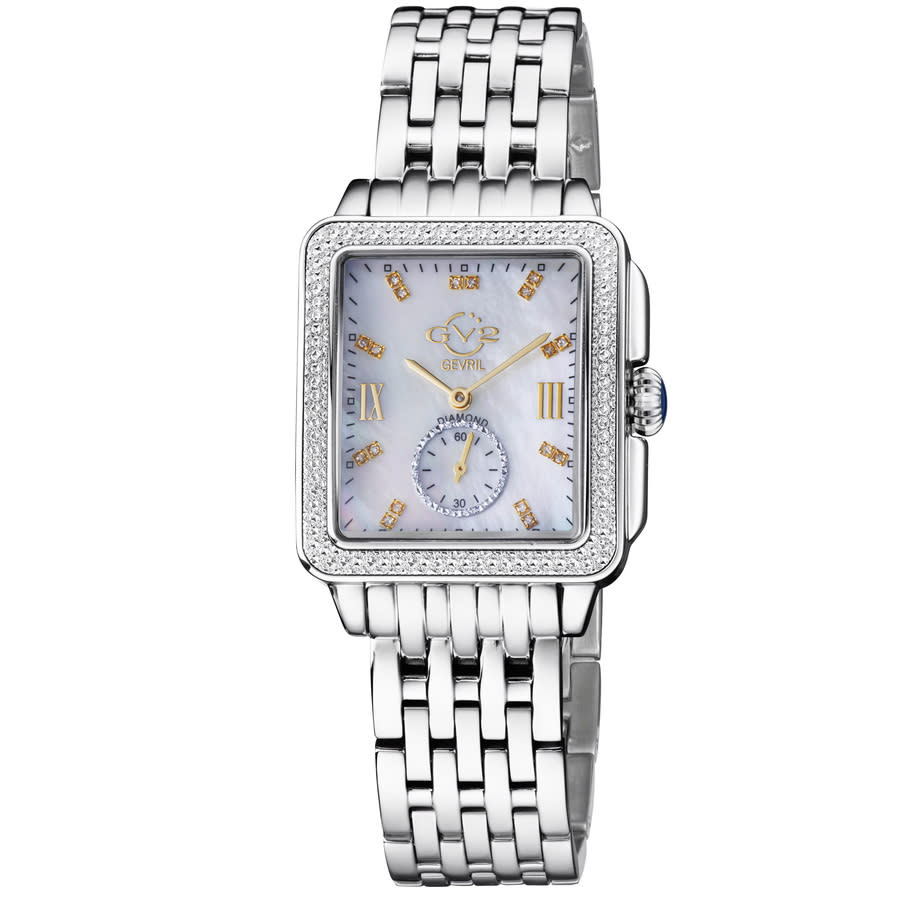 Silver-tone stainless steel case and bracelet. Fixed silver-tone stainless steel bezel. Mother of pearl dial with yellow gold-tone hands and Roman numeral & index hour markers. Minute markers around the outer rim. Dial Type: Analog. One subdial displaying: small second. Ronda Caliber 1069 quartz movement. Scratch resistant sapphire crystal. Pull / push crown. Solid case back. Rectangle case shape, case size: 34 mm, case thickness: 10.5 mm. Band width: 18 mm. Deployment with push button release clasp. Water resistant at 50 meters / 165 feet. Functions: hour, minute, small second. Bari Tortoise Series. Fashion watch style. Watch label: Swiss Movt. GV2 by Gevril Bari Tortoise Mother of Pearl Dial Ladies Watch 9258B.