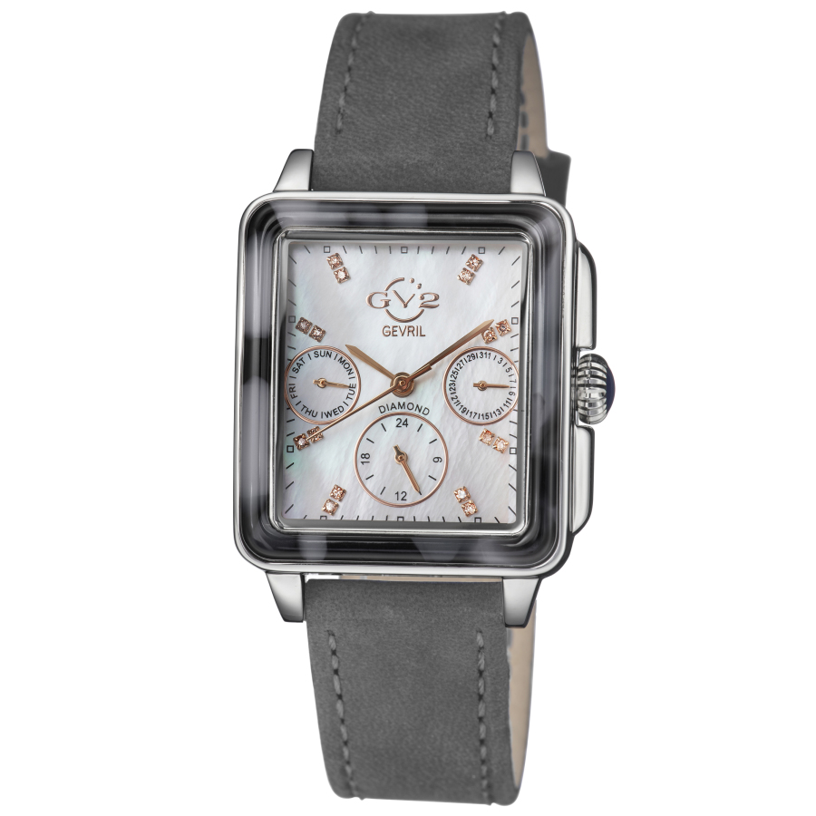 Silver-tone stainless steel case with a grey leather strap. Fixed grey stainless steel bezel. Mother of pearl dial with rose gold-tone hands and diamond hour markers. Minute markers around the outer rim. Dial Type: Analog. Date display at the 3 o'clock position. Three sub-dials displaying: date, day and 24 hour. ISA Caliber 9238 quartz movement. Scratch resistant sapphire crystal. Pull / push crown. Solid case back. Square case shape, case size: 37 mm, case thickness: 11 mm. Band width: 8 mm, band length: 7 inches. Buckle clasp. Water resistant at 3 meters / 10 feet. Functions: date, day, hour, minute, second. Bari-tortoise Series. Fashion watch style. Watch label: Swiss Made. GV2 by Gevril Bari-Tortoise Quartz Diamond Ladies Watch 9224.1.