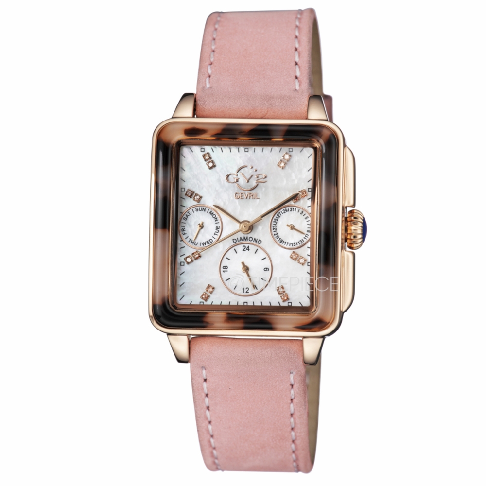 Rose gold-tone stainless steel case with a pink leather strap. Fixed bezel. White dial. Dial Type: Analog. Quartz movement. Scratch resistant sapphire crystal. Pull / push crown. Round case shape, case size: 37 mm, case thickness: 11 mm. Band width: 7.5 mm, band length: 8.5 inches. Buckle clasp. Water resistant at 30 meters / 100 feet. GV2 by Gevril Fashion WhiteDial Ladies Watch 9225.2.