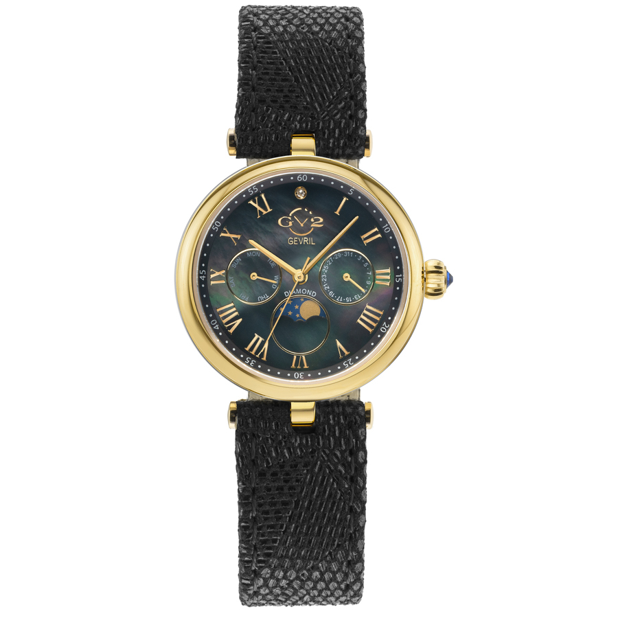 Gold-tone stainless steel case with a black leather strap. Fixed gold-tone stainless steel bezel. Black mother of pearl dial with gold-tone hands and diamond-Roman numeral hour markers. Minute markers around the outer rim. Dial Type: Analog. Date display at the 3 o'clock position. Three sub-dials displaying: date, day and moonphase. Quartz movement. Scratch resistant sapphire crystal. Pull / push crown. Solid case back. Round case shape, case size: 36 mm. Band width: 18 mm. Buckle clasp. Water resistant at 50 meters / 165 feet. Functions: date, day, hour, minute, second, moonphase. Florence Series. Fashion watch style. Watch label: Swiss Movt. GV2 by Gevril Florence Black Mother of Pearl Dial Ladies Watch 12506.