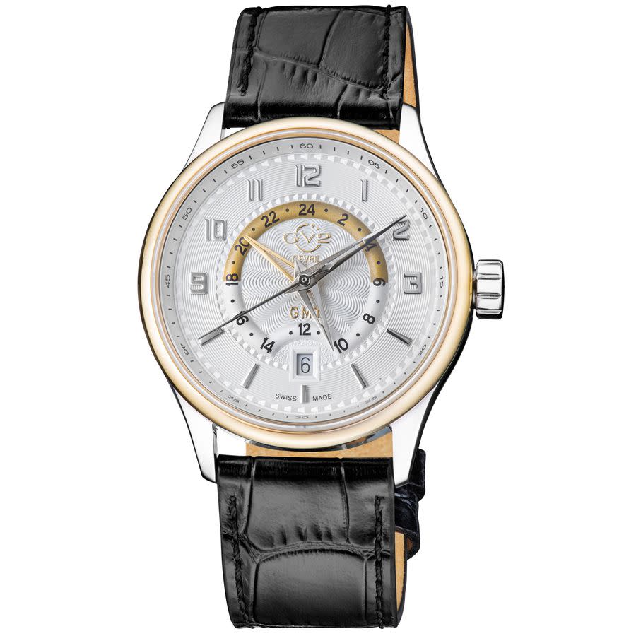 Silver-tone stainless steel case with a black leather strap. Fixed gold-tone stainless steel bezel. White dial with silver-tone hands and Arabic & index hour markers. Minute markers around the outer rim. Dial Type: Analog. Date display at the 6 o'clock position. Quartz movement. Scratch resistant sapphire crystal. Pull / push crown. Solid case back. Round case shape, case size: 42 mm, case thickness: 12 mm. Band width: 20 mm. Deployment with push button release clasp. Water resistant at 50 meters / 165 feet. Functions: date, hour, minute, second. Additional Info: GMT. Giromondo Series. Luxury watch style. Watch label: Swiss Made. GV2 by Gevril Giromondo Quartz White Dial Mens Watch 42307.