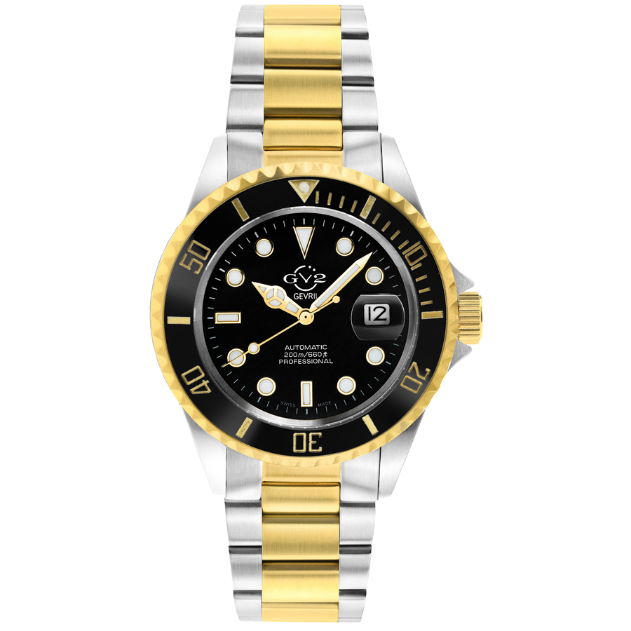 Stainless steel case with a two-tone (silver-tone and yellow gold-tone) stainless steel bracelet. Uni-directional rotating yellow gold-tone bezel with an inlaid black ring. Black dial with luminous gold-tone Mercedes-logo hands and index hour markers. Minute markers around the outer rim. Dial Type: Analog. Luminescent hands and markers. Date display at the 3 o'clock position. Automatic movement. Scratch resistant sapphire crystal. Screw down crown. Solid case back. Round case shape. Case size: 42 mm. Case thickness: 13 mm. Band width: 18 mm. Deployment clasp with a push button release. Water resistant at 200 meters / 660 feet. Functions: date, hour, minute, second, date magnifier. Liguria Series. Fashion watch style. Watch label: Swiss Made. GV2 by Gevril Liguria Automatic Black Dial Mens Watch 42257.
