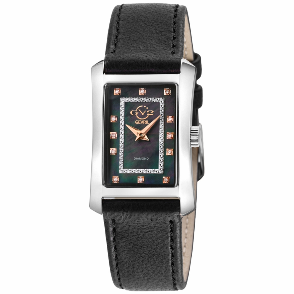 Silver-tone stainless steel case with a black genuine leather strap. Fixed silver-tone stainless steel bezel. Mother of pearl dial with rose gold-tone hands and diamond hour markers. Dial Type: Analog. Quartz movement. Scratch resistant sapphire crystal. Pull / push crown. Solid case back. Rectangle case shape, case size: 29 mm, case thickness: 9 mm. Band width: 18 mm. Buckle clasp. Water resistant at 50 meters / 165 feet. Functions: hour, minute. Additional Info: 12 diamonds. Luino Series. Fashion watch style. GV2 by Gevril Luino Quartz Diamond Ladies Watch 14601.