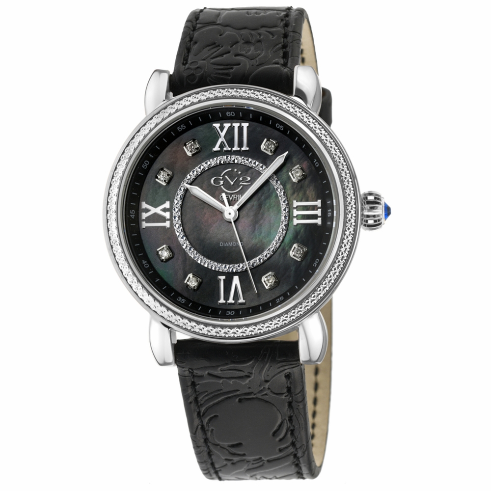 Silver-tone stainless steel case with a black genuine leather strap. Fixed silver-tone stainless steel bezel. Mother of pearl dial with silver-tone hands and diamond hour markers. Minute markers around the outer rim. Dial Type: Analog. Luminescent hands. Quartz movement. Scratch resistant sapphire crystal. Pull / push crown. Solid case back. Round case shape, case size: 37 mm, case thickness: 9 mm. Band width: 18 mm. Buckle clasp. Water resistant at 50 meters / 165 feet. Functions: hour, minute, second. Additional Info: 8 diamonds. Marsala Series. Fashion watch style. GV2 by Gevril Marsala Quartz Diamond Ladies Watch 9861.