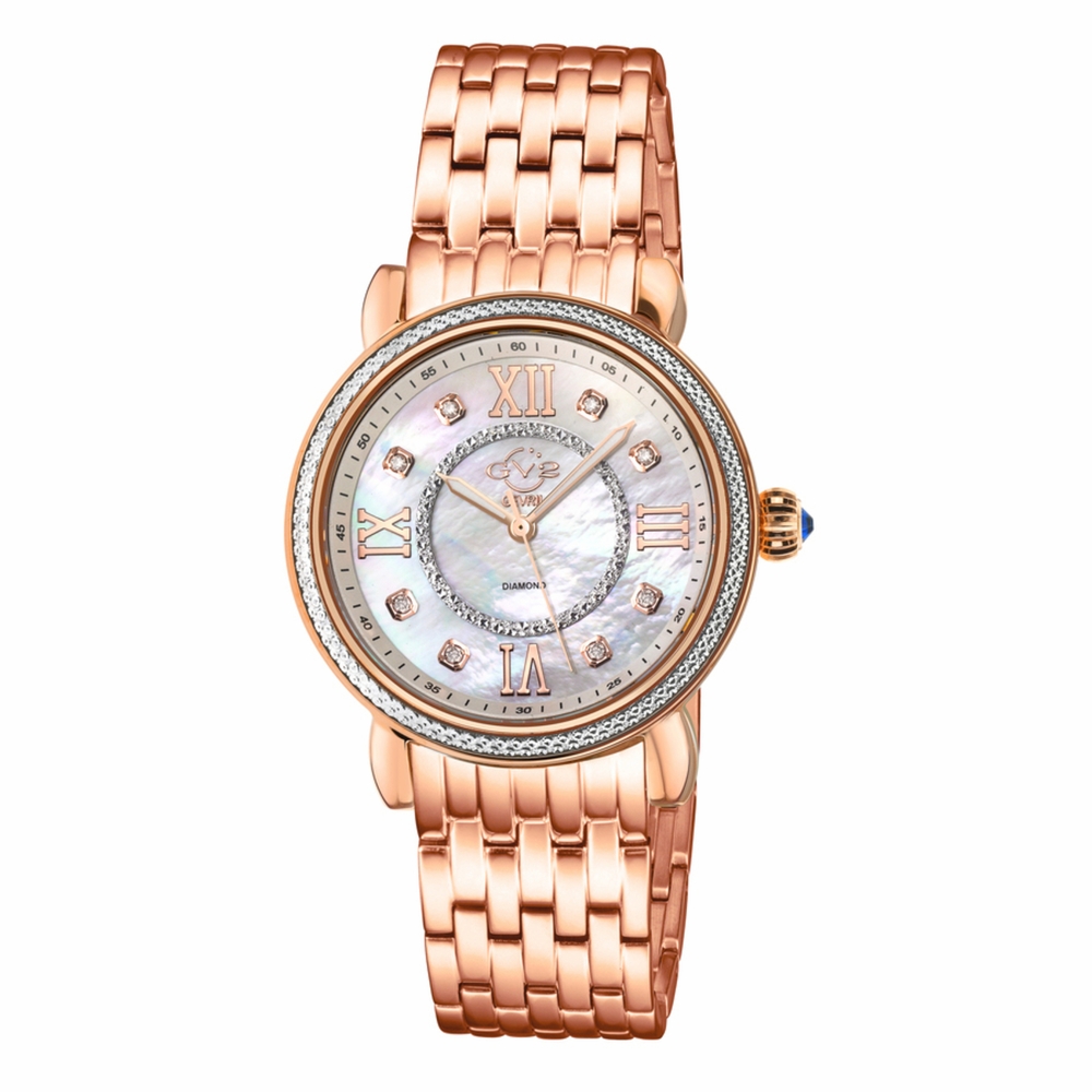 Rose gold-tone stainless steel case and bracelet. Fixed rose gold-tone stainless steel bezel. Mother of pearl dial with rose gold-tone hands and diamond hour markers. Minute markers around the outer rim. Dial Type: Analog. Quartz movement. Scratch resistant sapphire crystal. Pull / push crown. Solid case back. Round case shape, case size: 37 mm, case thickness: 9 mm. Band width: 18 mm. Deployment with push button release clasp. Water resistant at 50 meters / 165 feet. Functions: hour, minute, second. Additional Info: 8 diamonds. Marsala Series. Fashion watch style. GV2 by Gevril Marsala Diamond Mother of Pearl Dial Ladies Watch 9863B.