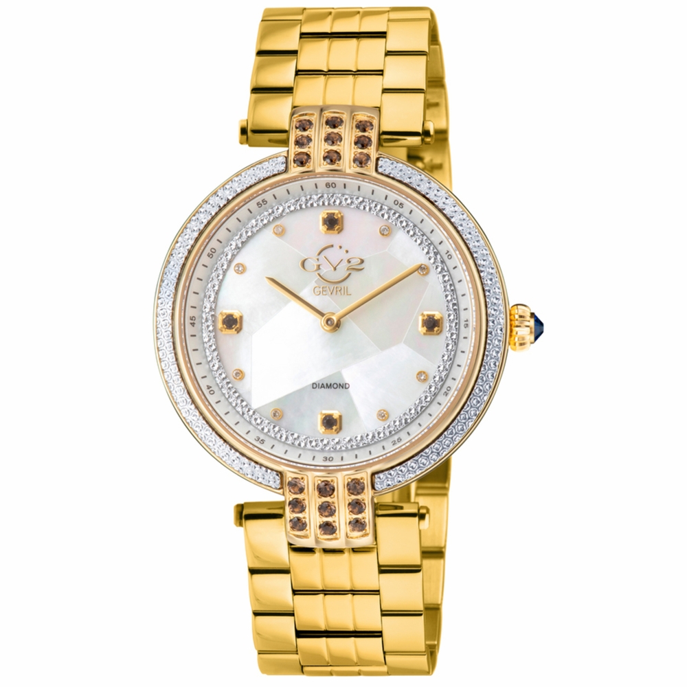 Yellow gold-tone stainless steel case and bracelet. Fixed yellow gold-tone stainless steel bezel. Mother of pearl dial with yellow gold-tone hands and diamond hour markers. Minute markers around the outer rim. Dial Type: Analog. Ronda Caliber 762 quartz movement. Scratch resistant sapphire crystal. Pull / push crown. Solid case back. Round case shape, case size: 35 mm, case thickness: 8.5 mm. Band width: 18 mm. Deployment with push button release clasp. Water resistant at 50 meters / 165 feet. Functions: hour, minute. Additional Info: 8 diamonds and 22 gemstones. Matera Series. Fashion watch style. Watch label: Swiss Movt. GV2 by Gevril Matera Diamond Mother of Pearl Dial Ladies Watch 12808B.