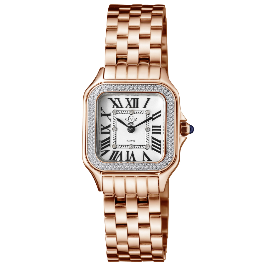 Rose gold-tone stainless steel case with a rose gold-tone stainless steel bracelet. Fixed rose gold-tone stainless steel bezel. White dial with black hands and Roman numeral hour markers. Minute scale around the inner rim. Dial Type: Analog. Ronda Caliber 762 quartz movement. Scratch resistant sapphire crystal. Pull / push crown. Solid case back. Square case shape, case size: 27.5 mm, case thickness: 9 mm. Band width: 16 mm. Deployment with push button release clasp. Water resistant at 50 meters / 165 feet. Functions: hour, minute. Fashion watch style. Watch label: Swiss Movt. GV2 by Gevril Milan Quartz White Dial Ladies Watch 12101B.