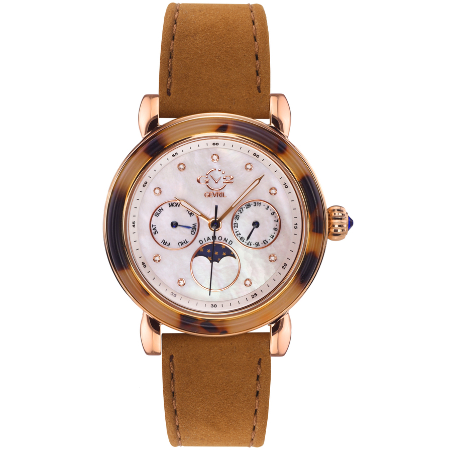 Rose gold-tone stainless steel case with a brown leather strap. Fixed rose gold-tone stainless steel bezel. Mother of pearl dial with rose gold-tone sword-shaped hands and index & diamond hour markers. Minute markers around the outer rim. Dial Type: Analog. Luminescent hands. Date display at the 3 o'clock position. Three - day, date, moonphase subdials. Ronda Caliber 706.1 quartz movement. Scratch resistant sapphire crystal. Pull / push crown. Solid case back. Round case shape, case size: 36 mm, case thickness: 9.5 mm. Band width: 18 mm. Buckle clasp. Water resistant at 30 meters / 100 feet. Functions: date, day, hour, minute, second, moon phase. Fashion watch style. Watch label: Swiss Movt. GV2 by Gevril Moon Valley Quartz Diamond Ladies Watch 9825.6.