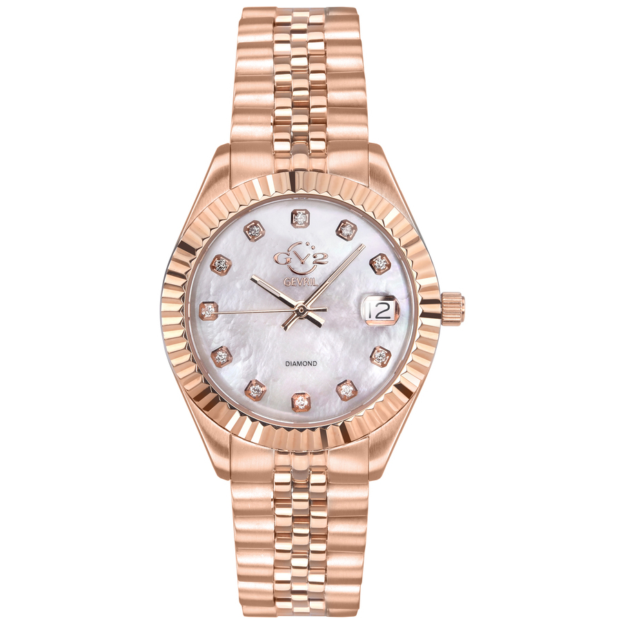 Rose gold-tone stainless steel case with a rose gold-tone stainless steel bracelet. Fixed rose gold-tone stainless steel bezel. Mother of pearl dial with rose gold-tone hands and diamond hour markers. Dial Type: Analog. Luminescent hands. Date display at the 3 o'clock position. Ronda Caliber 705 quartz movement. Scratch resistant sapphire crystal. Pull / push crown. Solid case back. Round case shape, case size: 34 mm, case thickness: 10 mm. Band width: 16 mm. Deployment with push button release clasp. Water resistant at 50 meters / 165 feet. Functions: date, hour, minute, second. Fashion watch style. Watch label: Swiss Movt. GV2 by Gevril Naples Quartz Diamond Ladies Watch 12403.