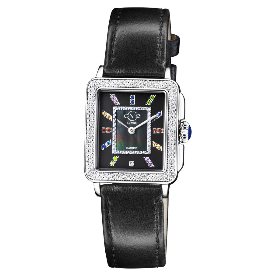 Silver-tone stainless steel case with a black genuine leather strap. Fixed silver-tone stainless steel bezel. Mother of pearl dial with silver-tone hands and diamond hour markers. Dial Type: Analog. Quartz movement. Scratch resistant sapphire crystal. Pull / push crown. Solid case back. Rectangle case shape, case size: 30 mm, case thickness: 9.5 mm. Band width: 18 mm. Buckle clasp. Water resistant at 50 meters / 165 feet. Functions: hour, minute. Additional Info: 1 diamond 22 gemstones. Padova Gemstone Series. Fashion watch style. GV2 by Gevril Padova Gemstone Quartz Diamond Ladies Watch 12330.