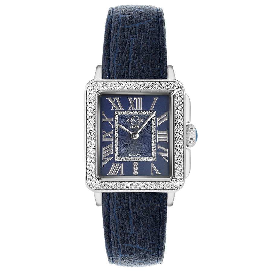 Stainless steel case with a blue (vegan) leather strap. Fixed (diamond-cut) stainless steel bezel. Blue dial with silver-tone sword-shaped hands and Roman numeral hour markers. Crystals set at the 6 o'clock position. Dial Type: Analog. Ronda 762 quartz movement. Scratch resistant sapphire crystal. Pull / push crown. Solid case back. Rectangle case shape. Case size: 27 mm. Case thickness: 9.5 mm. Band width: 18 mm. Tang clasp. Water resistant at 30 meters / 100 feet. Functions: hour, minute. Padova Vegan Series. Fashion watch style. Watch label: Swiss Made. GV2 by Gevril Padova Vegan Quartz Diamond Blue Dial Ladies Watch 12320-V.