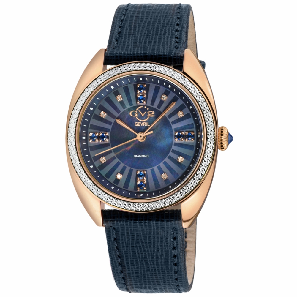 Rose gold-tone stainless steel case with a blue leather strap. Fixed rose gold-tone stainless steel bezel. Mother of pearl dial with rose gold-tone hands and diamond hour markers. Minute markers around the outer rim. Dial Type: Analog. Quartz movement. Scratch resistant sapphire crystal. Pull / push crown. Solid case back. Round case shape, case size: 35 mm, case thickness: 8.5 mm. Band width: 17 mm. Buckle clasp. Water resistant at 50 meters / 165 feet. Functions: hour, minute, second. Additional Info: 8 diamonds and 8 gemstones. Palermo Series. Fashion watch style. GV2 by Gevril Palermo Diamond Mother of Pearl Dial Ladies Watch 13104.