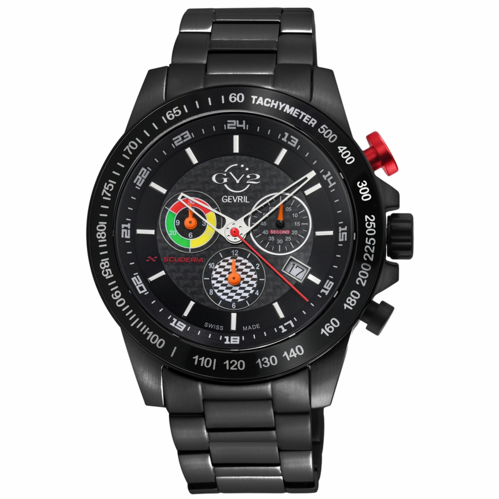 Black stainless steel case and bracelet. Fixed tachymeter scale black stainless steel bezel. Black dial with silver-tone hands and index hour markers. Minute markers around the outer rim. Dial Type: Analog. Date display at the 4 o'clock position. Chronograph - three sub-dials displaying: 60 second, 30 minute and 12 hour. Quartz movement. Scratch resistant sapphire crystal. Pull / push crown. Solid case back. Round case shape, case size: 45 mm, case thickness: 13.5 mm. Band width: 20 mm. Deployment with push button release clasp. Water resistant at 100 meters / 330 feet. Functions: chronograph, date, hour, minute, second. Additional Info: chronograph, tachymeter. Scuderia Series. Luxury watch style. Watch label: Swiss Made. GV2 by Gevril Scuderia Black Dial Mens Watch 9923B.
