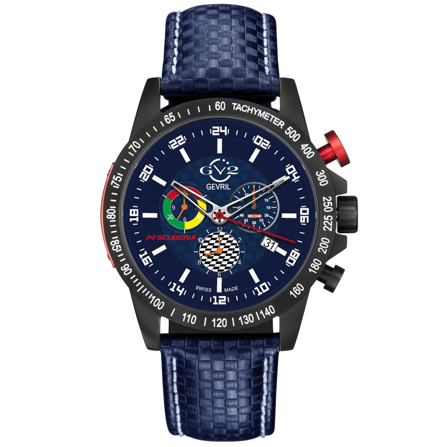 Black-plated stainless steel case with a blue leather strap. Fixed black-plated bezel showing tachymeter markings. Blue dial with silver-tone skeleton hands and index hour markers. 24 hour (GMT) markers. Minute markers around the outer rim. Dial Type: Analog. Date display at the 4 o'clock position. Chronograph - three sub-dials displaying: 60 second, 60 minute and 12 hour. ISA caliber 8173 quartz movement. Scratch resistant sapphire crystal. Pull / push crown. Solid case back. Round case shape. Case size: 45 mm. Case thickness: 12.3 mm. Band width: 20 mm. Tang clasp. Water resistant at 100 meters / 330 feet. Functions: chronograph, date, hour, minute, second. Scuderia Series. Fashion watch style. GV2 by Gevril Scuderia Chronograph Quartz Blue Dial Mens Watch 9911.