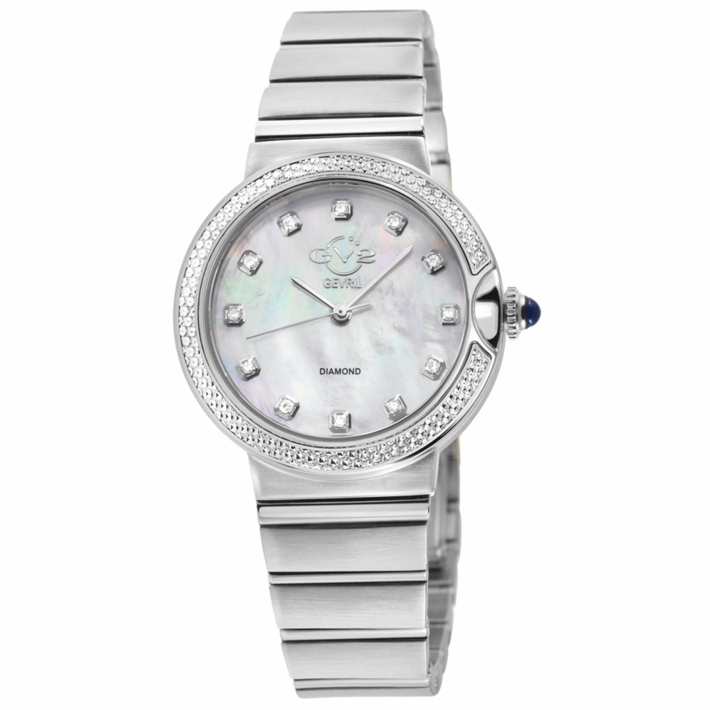 Silver-tone stainless steel case and bracelet. Fixed silver-tone stainless steel bezel. Mother of pearl dial with silver-tone hands and diamond hour markers. Dial Type: Analog. Quartz movement. Scratch resistant sapphire crystal. Pull / push crown. Solid case back. Round case shape, case size: 32 mm, case thickness: 8.5 mm. Band width: 14 mm. Deployment with push button release clasp. Water resistant at 50 meters / 165 feet. Functions: hour, minute, second. Additional Info: 12 diamonds. Sorrento Series. Fashion watch style. GV2 by Gevril Sorrento Diamond Mother of Pearl Dial Ladies Watch 12445B.