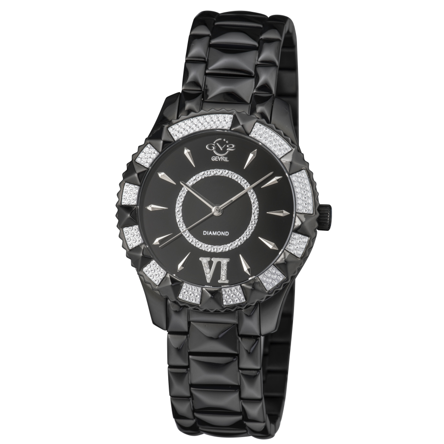 Black stainless steel case with a black stainless steel bracelet. Fixed black stainless steel bezel. Black dial with silver-tone hands and Roman numeral & index hour markers. Dial Type: Analog. Ronda 763 Swiss Quartz quartz movement. Scratch resistant sapphire crystal. Pull / push crown. Solid case back. Round case shape, case size: 39 mm, case thickness: 10 mm. Band width: 18 mm. Deployment with push button release clasp. Water resistant at 50 meters / 165 feet. Functions: hour, minute, second. Fashion watch style. GV2 by Gevril Venice Quartz Black Dial Ladies Watch 11713-425.