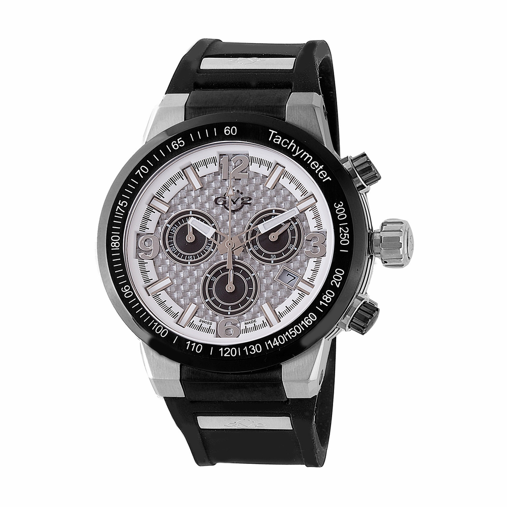 Silver-tone stainless steel case with a black silicone strap. Tachymeter black stainless steel bezel. Silver carbon fiber dial with silver-tone hands and index hour markers. Minute markers around the outer rim. Dial Type: Analog. Luminescent hands and markers. Date display at the 4 o'clock position. Chronograph - three sub-dials displaying: 60 second, 30 minute and 12 hour. Ronda Caliber 5030.D Swiss-quartz movement. Scratch resistant antireflective sapphire crystal. Solid case back. Round case shape, case size: 44 mm, case thickness: 12.2 mm. Band width: 25 mm, band length: 8.5 inches. Deployant buckle clasp. Water resistant at 100 meters / 330 feet. Functions: chronograph, date, hour, minute, second. Sport watch style. Watch label: Swiss Made. GV2 by Gevril Novara Silver Carbon Fiber Dial Mens Watch 8204.