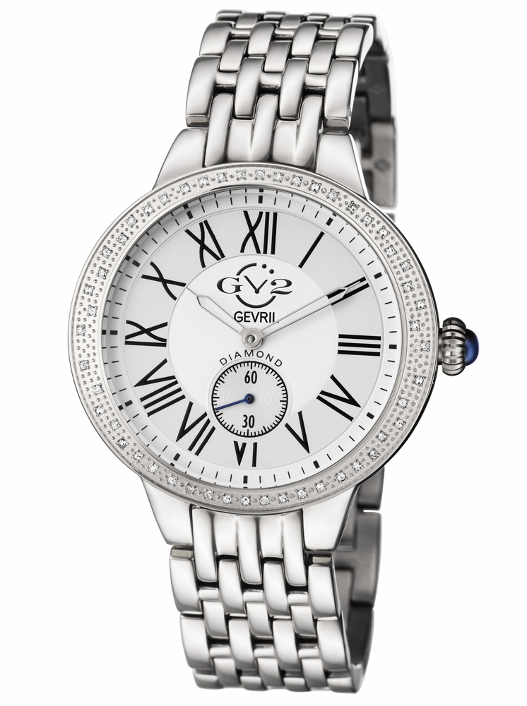 Stainless steel case with a stainless steel bracelet. Fixed with 50 diamonds bezel. Silver dial with silver-tone hands and black Roman numeral hour markers. Minute markers around the outer rim. Dial Type: Analog. One - 60 second. Quartz movement. Scratch resistant mineral crystal. Solid case back. Case diameter: 40 mm. Case thickness: 9.5 mm. Round case shape. Deployment with push button clasp. Water resistant at 30 meters / 100 feet. Functions: hour, minute, second. Additional Info: interchangeable white leather strap; limited edition -. Dress watch style. Watch label: Swiss Made. GV2 by Gevril Astor Diamond Bezel Quartz Ladies Watch 9100.