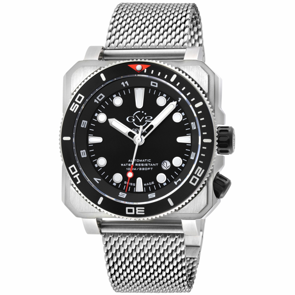 Silver-tone stainless steel case and bracelet. Uni-directional rotating black stainless steel bezel. Black dial with silver-tone hands and index hour markers. Minute markers around the outer rim. Dial Type: Analog. Luminescent hands and markers. Date display between 4 and 5 o'clock position. Sellita SW220 automatic movement. Scratch resistant sapphire crystal. Screw down crown. Transparent case back. Square case shape, case size: 44 mm, case thickness: 13 mm. Band width: 22 mm. Deployment with push button release clasp. Water resistant at 100 meters / 330 feet. Functions: date, hour, minute, second. Additional Info: dual time zone inner rotating bezel. Xo Submarine Series. Fashion watch style. Watch label: Swiss Made. GV2 by Gevril XO Submarine Automatic Black Dial Mens Watch 4541B.