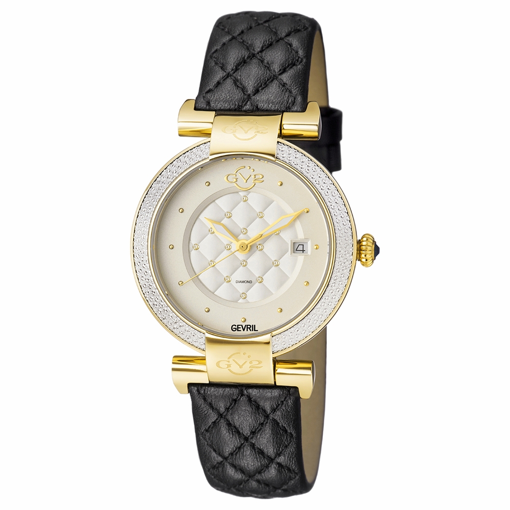 Stainless steel case with a black leather strap. Stationary silver-tone diamond set bezel. White dial with gold-tone hands and diamond hour markers. Dial Type: Analog. Luminescent hands. Ronda Caliber 705 quartz movement. Scratch resistant antireflective sapphire crystal. Case size: 37 mm. Case thickness: 8.1 mm. Round case shape. Band width: 18 mm. Band length: 7.5 inches. Deployant buckle clasp. Water resistant at 30 meters / 100 feet. Functions: date, hour, minute, second. Dress watch style. Watch label: Swiss Made. GV2 Berletta White Dial Diamond Ladies Watch 1503.