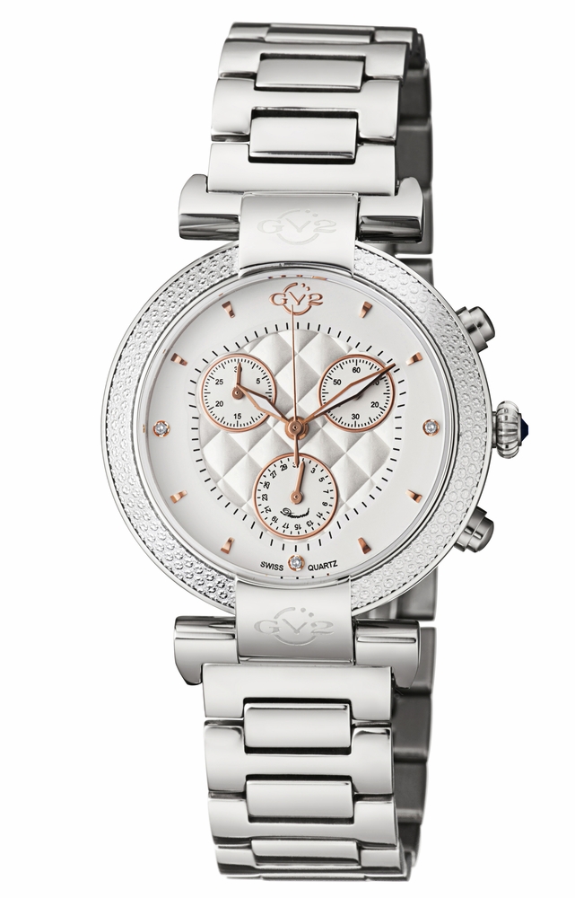 Stainless steel case with a silver stainless steel bracelet. Stationary silver-tone diamond set bezel. White dial with index hour markers. Minute markers around the innerrim. Dial Type: Analog. Date display at the 6 o'clock position. Chronograph - three sub-dials displaying: 60 second, 30 minute and date. ISA Caliber 8171/202 quartz movement. Scratch resistant antireflective sapphire crystal. Case size: 37 mm. Case thickness: 9.1 mm. Round case shape. Band length: 7.5 inches. Deployant buckle clasp. Water resistant at 30 meters / 100 feet. Functions: chronograph, date, hour, minute, second. Dress watch style. Watch label: Swiss Made. GV2 Berletta Chronograph Diamond Ladies Watch 1550.