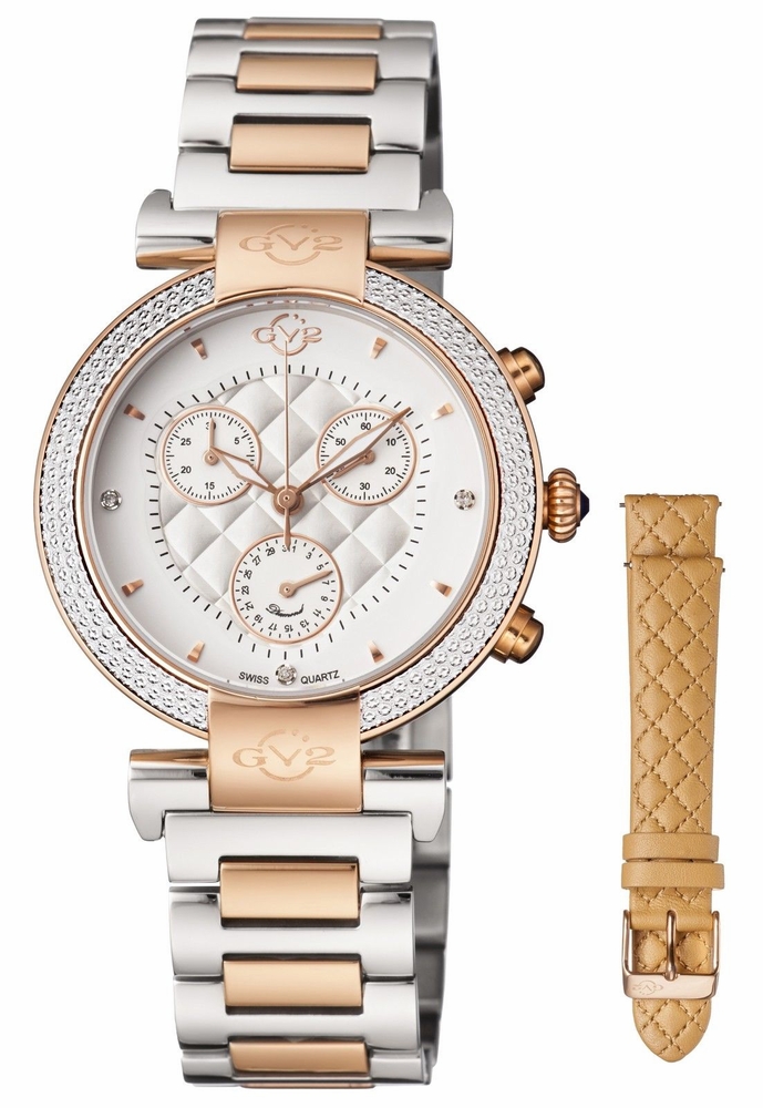 Silver-tone stainless steel case with a two-tone (gold-tone and silver-tone) stainless steel bracelet. Stationary silver-tone diamond set bezel. White dial with gold-tone hands and index hour markers. Minute markers around the innerrim. Dial Type: Analog. Luminescent hands. Date display at the 6 o'clock position. Chronograph - three sub-dials displaying: 60 second, 30 minute and date. ISA Caliber 8171/202 quartz movement. Scratch resistant antireflective sapphire crystal. Case size: 37 mm. Case thickness: 9.1 mm. Round case shape. Band width: 19 mm. Band length: 7.5 inches. Deployant buckle clasp. Water resistant at 30 meters / 100 feet. Functions: chronograph, date, hour, minute, second. Dress watch style. Watch label: Swiss Made. GV2 Berletta White Dial Chronograph Diamond Ladies Watch 1553.