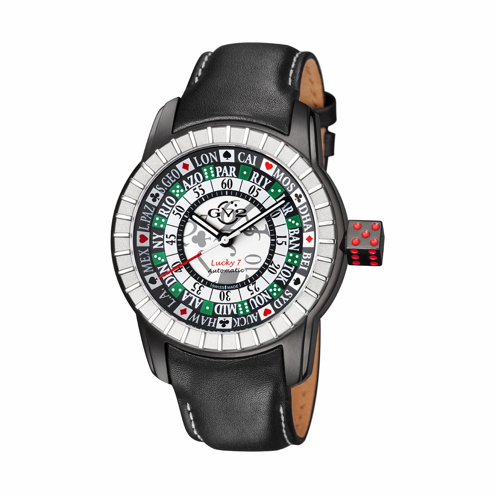 Stainless steel case with a black leather strap. Stationary silver-tone bezel. White dial with black hands and Arabic numeral hour markers. Dial Type: Analog. Luminescent hands and markers. Technosablier Caliber MD3G automatic movement. Scratch resistant mineral crystal. Case size: 48 mm. Case thickness: 17.5 mm. Round case shape. Band width: 23 mm. Band length: 8.5 inches. Buckle clasp. Water resistant at 50 meters / 165 feet. Functions: hour, minute, second. Dress watch style. Watch label: Swiss Made. GV2 Lucky 7 Automatic Mens Watch 9308.