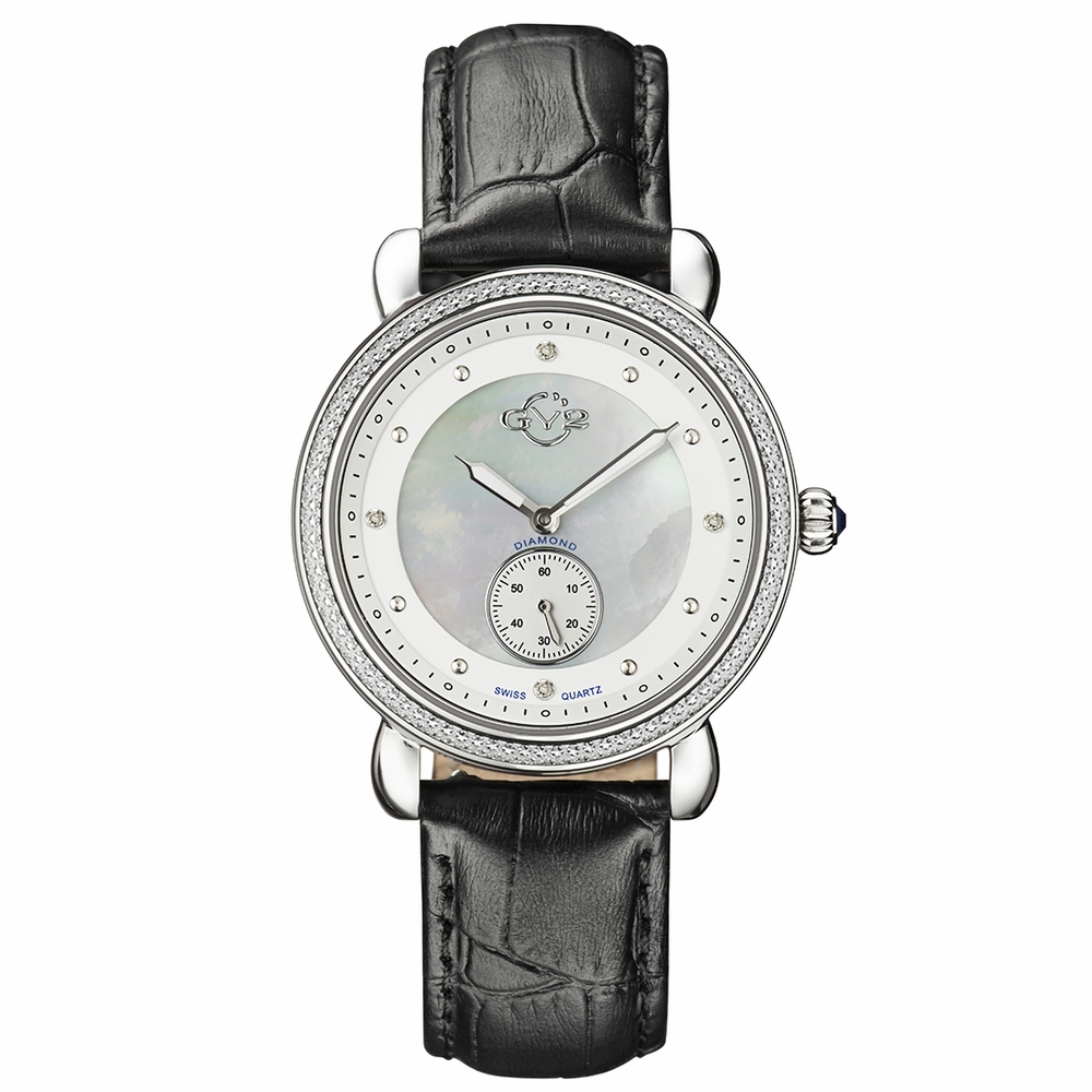 Silver-tone stainless steel case with a grey leather strap. Stationary silver-tone stainless steel bezel. Mother of pearl dial with silver-tone hands and dot hour markers. Dial Type: Analog. One- small seconds subdials. Swiss-quartz movement. Scratch resistant antireflective sapphire crystal. Solid case back. Case size: 37 mm. Case thickness: 8.8 mm. Round case shape. Buckle clasp. Water resistant at 30 meters / 100 feet. Functions: hour, minute, second. GV2 Marsala Mother of Pearl Dial Ladies Leather Watch 9834.
