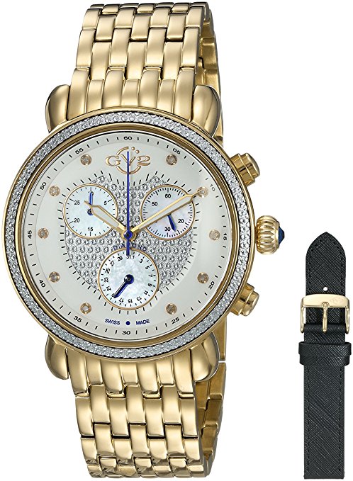 Gold-tone stainless steel case with a gold-tone stainless steel bracelet. Fixed gold-tone stainless steel bezel. White dial with gold-tone hands. Minute markers around the outer rim. Dial Type: Analog. Date display at the 6 o'clock position. Chronograph - three sub-dials displaying: 60 second, 30 minute and date. ISA Caliber 8171/202 quartz movement. Scratch resistant antireflective sapphire crystal. Solid case back. Case size: 37 mm. Case thickness: 9 mm. Round case shape. Buckle clasp. Water resistant at 30 meters / 100 feet. Functions: chronograph, date, hour, minute, second. Sport watch style. Watch label: Swiss Made. GV2 Marsala Chronograph Ladies Watch 9882.