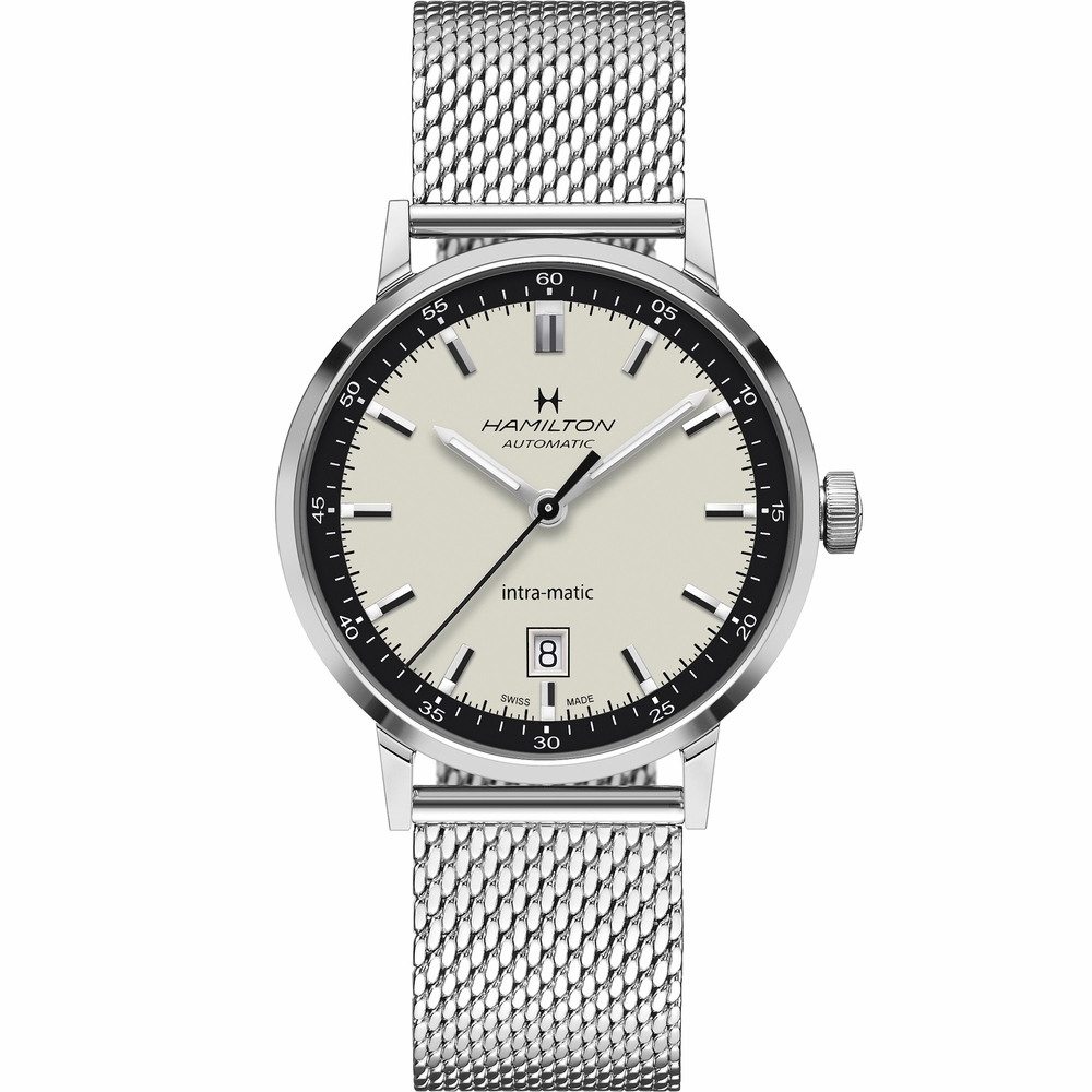 Silver-tone stainless steel case and bracelet. Fixed bezel. White dial with silver-tone hands and index hour markers. Minute scale around the inner rim. Dial Type: Analog. Date display at the 6 o'clock position. Hamilton Calibre H-10 Automatic movement, based upon ETA C07.111, containing 25 Jewels, bitting at 21600 vph, and has a power reserve of approximately 80 hours. Scratch resistant sapphire crystal. Round case shape, case size: 40 mm. Band width: 20 mm. Folding clasp. Water resistant at 50 meters / 165 feet. Functions: date, hour, minute, second. American Classic Intra-matic Series. Watch label: Swiss Made. Hamilton American Classic Intra-Matic Automatic White Dial Mens Watch H38425120.