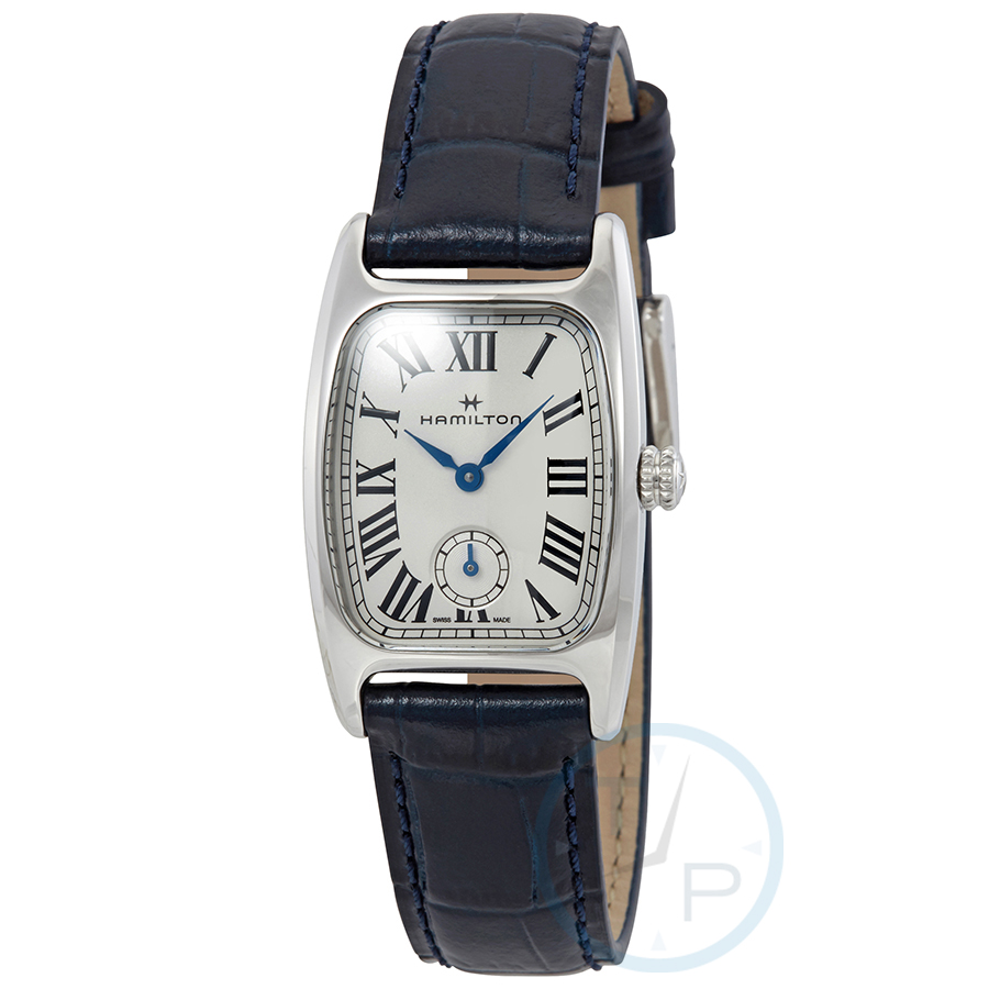 Stainless steel case with a blue leather strap. Fixed stainless steel bezel. Silver white dial with blue alpha-style hands and black Roman numeral hour markers. Minute markers around the outer rim. Dial Type: Analog. One subdial displaying: small second. ETA caliber 980.163 quartz movement. Scratch resistant mineral crystal. Pull / push crown. Solid case back. Tonneau case shape. Case dimensions: 27.4 mm x 23.5 mm. Case thickness: 8.64 mm. Band width: 16 mm. Tang clasp. Water resistant at 50 meters / 165 feet. Functions: hour, minute, second. Boulton Series. Dress watch style. Watch label: Swiss Made. Hamilton Boulton Silver-White Dial Blue Leather Ladies Watch H13321611.