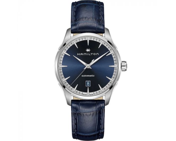 Silver-tone stainless steel case with a blue calf leather strap. Fixed bezel. Blue dial with silver-tone hands and index hour markers. Dial Type: Analog. Luminescent hands and markers. Date display at the 6 o'clock position. Hamilton Calibre H-10 Automatic movement, based upon ETA C07.111, containing 25 Jewels, bitting at 21600 vph, and has a power reserve of approximately 80 hours. Scratch resistant sapphire crystal. Round case shape, case size: 40 mm. Band width: 20 mm. Water resistant at 50 meters / 165 feet. Functions: date, hour, minute, second. Jazzmaster Series. Watch label: Swiss Made. Hamilton Jazzmaster Automatic Blue Dial Mens Watch H32475640.