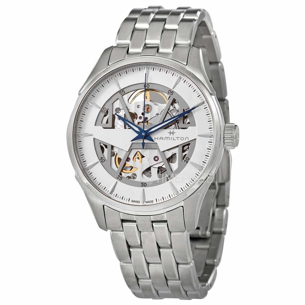 Stainless steel case with a stainless steel bracelet. Fixed stainless steel bezel. White (skeleton center) dial with luminous blue hands and index hour markers. Arabic numeral minute markers (at 5 minute intervals). Minute markers around the outer rim. Dial Type: Analog. Luminescent hands and markers. Hamilton calibre H-10 automatic movement, based upon ETA C07.111, containing 25 Jewels, bitting at 21600 vph, and has a power reserve of approximately 80 hours. Scratch resistant sapphire crystal. Transparent case back. Round case shape. Case size: 40 mm. Case thickness: 11.05 mm. Band width: 20 mm. Fold over clasp. Water resistant at 50 meters / 165 feet. Functions: hour, minute, second. Jazzmaster Series. Casual watch style. Watch label: Swiss Made. Hamilton Jazzmaster Automatic Skeleton White Dial Mens Watch H42535110.