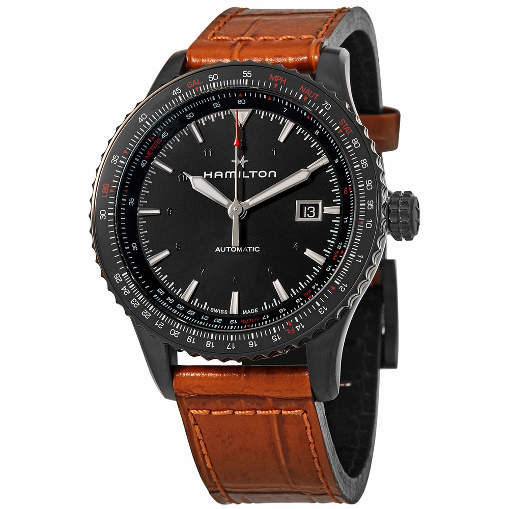 Black-plated stainless steel case with a brown leather strap. Bi-directional rotating black-plated bezel. Black dial with silver-tone hands and index / small Arabic numeral hour markers. Minute markers. Conversion / consumption scale around the outer rim. Dial Type: Analog. Luminescent hands and markers. Date display at the 3 o'clock position. Hamilton calibre H-10 automatic movement, based upon ETA C07.111, containing 25 Jewels, bitting at 21600 vph, and has a power reserve of approximately 80 hours. Scratch resistant sapphire crystal. Screw down crown. Transparent case back. Round case shape. Case size: 42 mm. Case thickness: 10.9 mm. Band width: 20 mm. Tang clasp. Water resistant at 100 meters / 330 feet. Functions: date, hour, minute, second. Khaki Aviation Series. Luxury watch style. Watch label: Swiss Made. Hamilton Khaki Aviation Automatic Black Dial Mens Watch H76625530.
