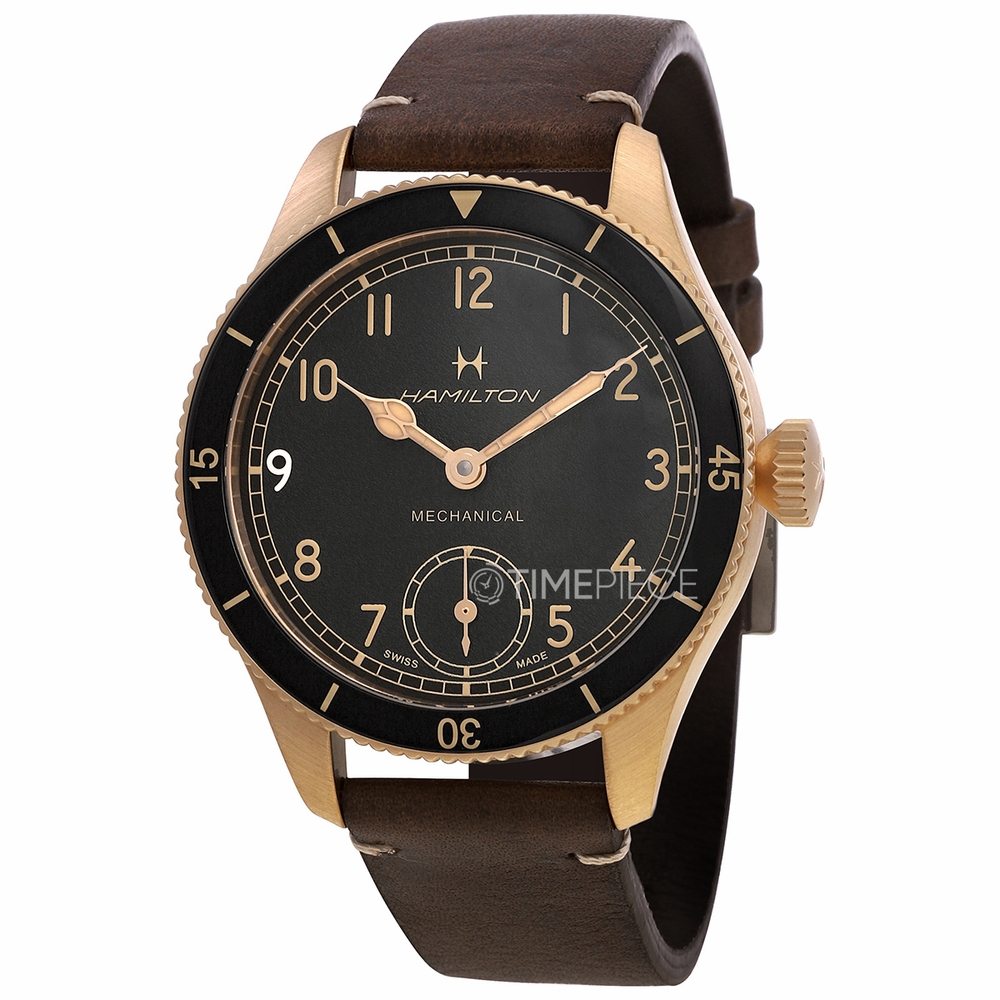 Bronze and titanium case with a brown leather strap. Bi-directional rotating black bezel. Black dial with bronze hands and Arabic numeral hour markers. Minute markers around the outer rim. Dial Type: Analog. Luminescent hands and markers. One subdial displaying: small second. ETA Caliber 6498-1 Hand Wind movement, containing 17 Jewels, bitting at 19800 vph, and has a power reserve of approximately 46 hours. Scratch resistant sapphire crystal. Pull / push crown. Transparent see through case back. Round case shape, case size: 43 mm. Band width: 18 mm. Tang clasp. Water resistant at 100 meters / 330 feet. Functions: hour, minute, small second. Khaki Aviation Pioneer Series. Casual watch style. Watch label: Swiss Made. Hamilton Khaki Aviation Pioneer Hand Wind Black Dial Mens Watch H76709530.